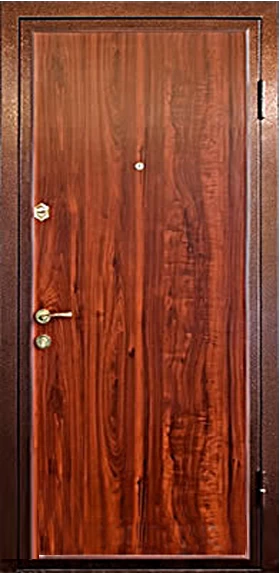 Ламинированные с внутренней стороны двери снаружи можно отделать любым способом - от экономичной винилискожи до премиального массива или натурального шпона, декорированную зеркальными вставками, витражом, кованными элементами.