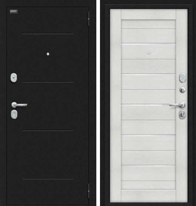 Надежная входная Браво Техно Kale Букле черное/Bianco Veralinga премиум класса по цене 36 920 руб. Большая толщина стали защитит от проникновения в ваш дом, квартиру или коттедж. Используется очень качественная фурнитура: замки, цилиндры, ручки, защелки. Покрытие и отделка двери изготовлено под внимательным контролем производителя. Дверь имеет долгий срок службы и гарантию.